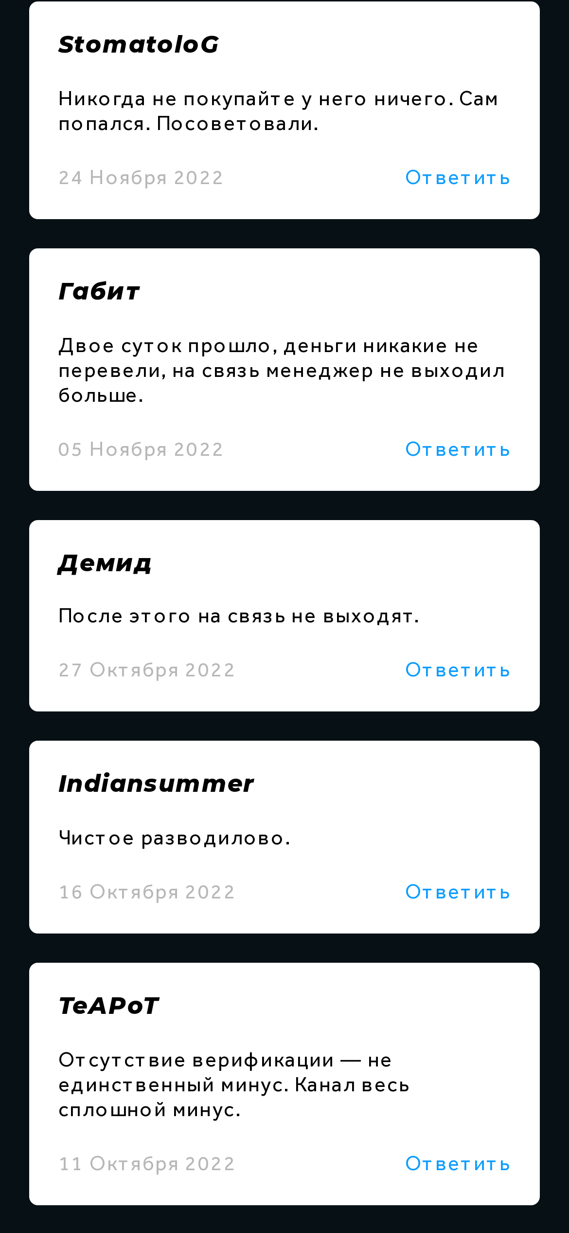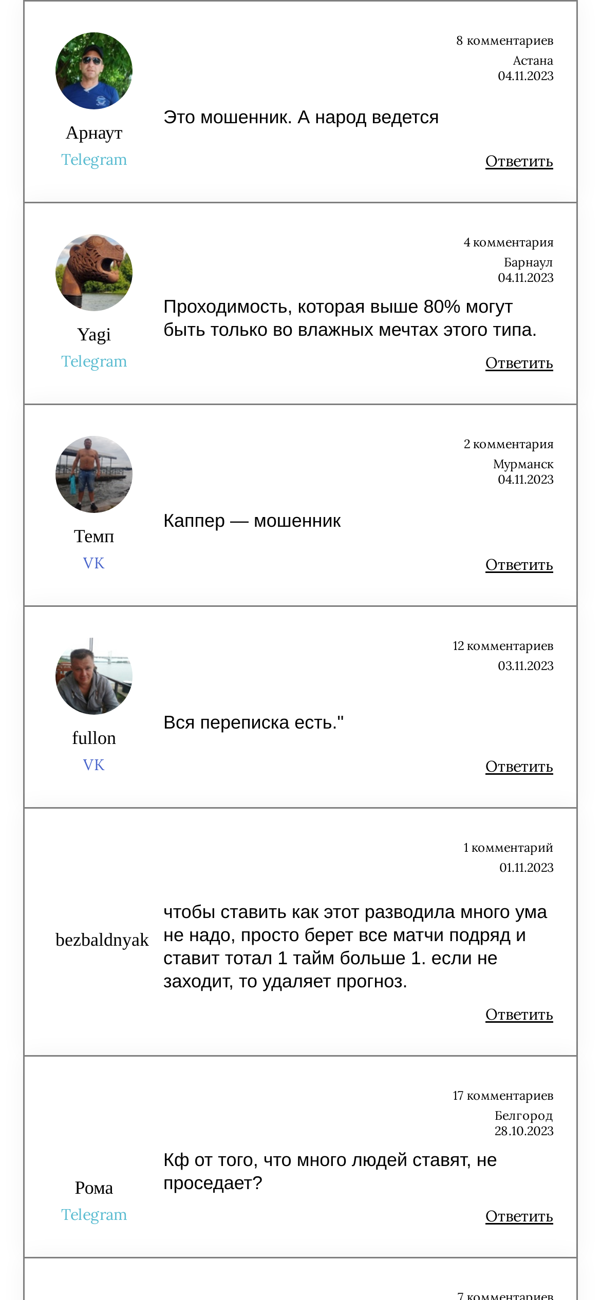 Отзывы о каппере Руслан Чубарь на самом проекте публикуются в виде скринов переписок. Прогнозист выкладывает лишь положительные отклики. Их достоверность вызывает сомнение. Обычные комментарии на проекте заблокированы.