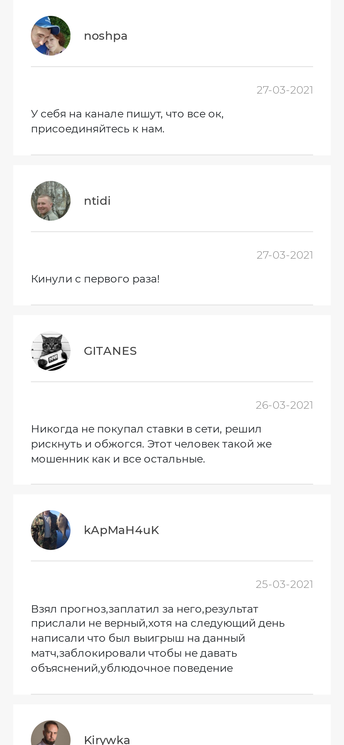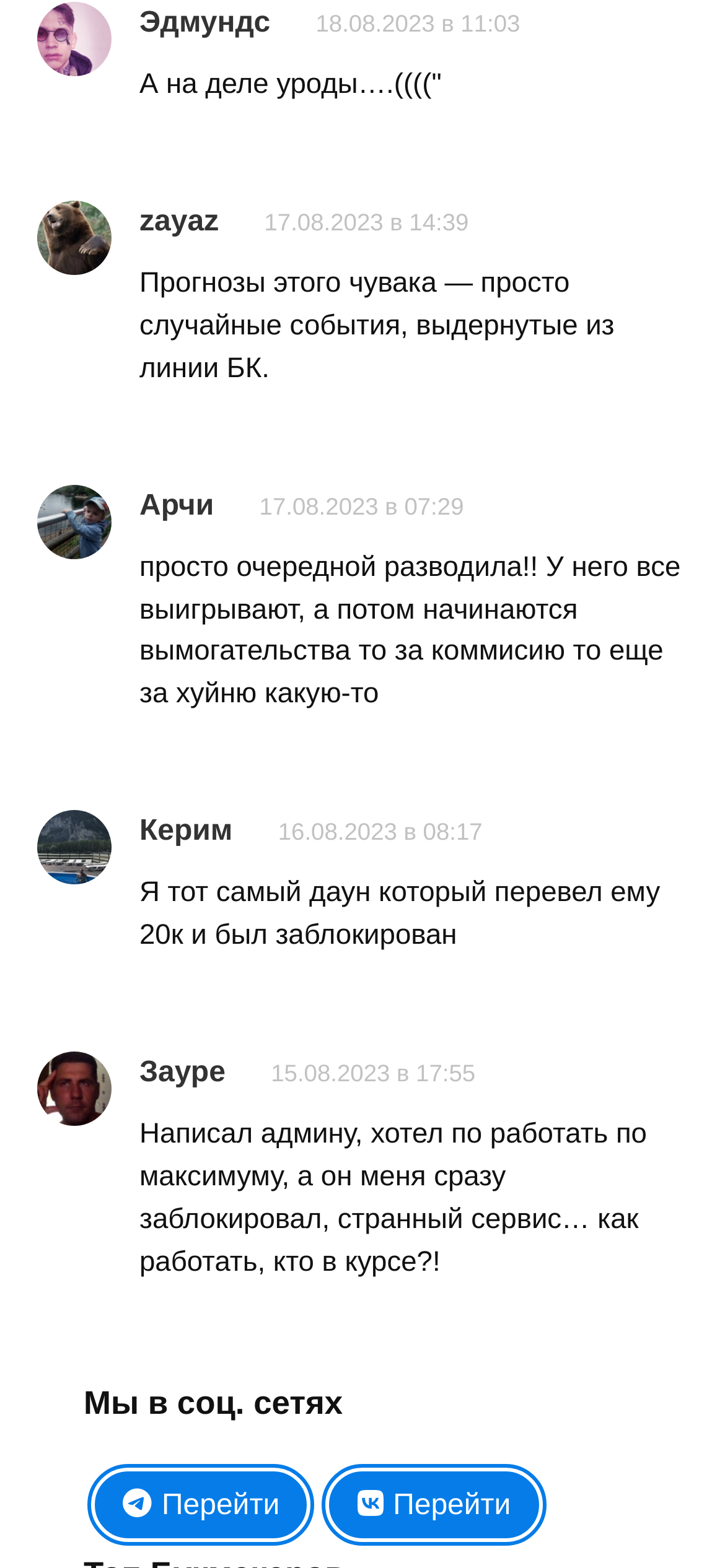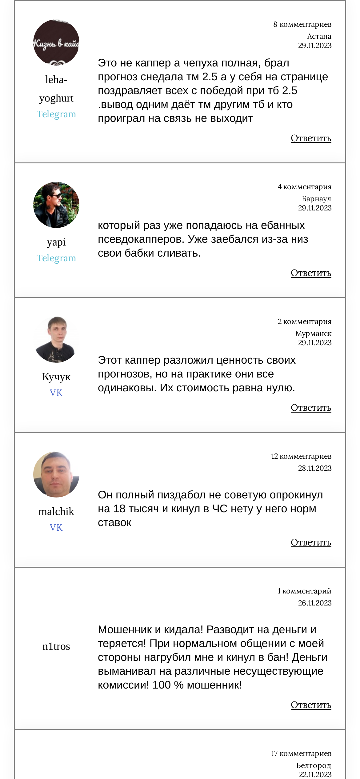 Проверка сторонних ресурсов позволила выявить лишь негативные отзывы. Реальные пользователи подтверждают, что прогнозы каппера КС Бет не дают прибыль, включая те, что предлагаются на платной основе.