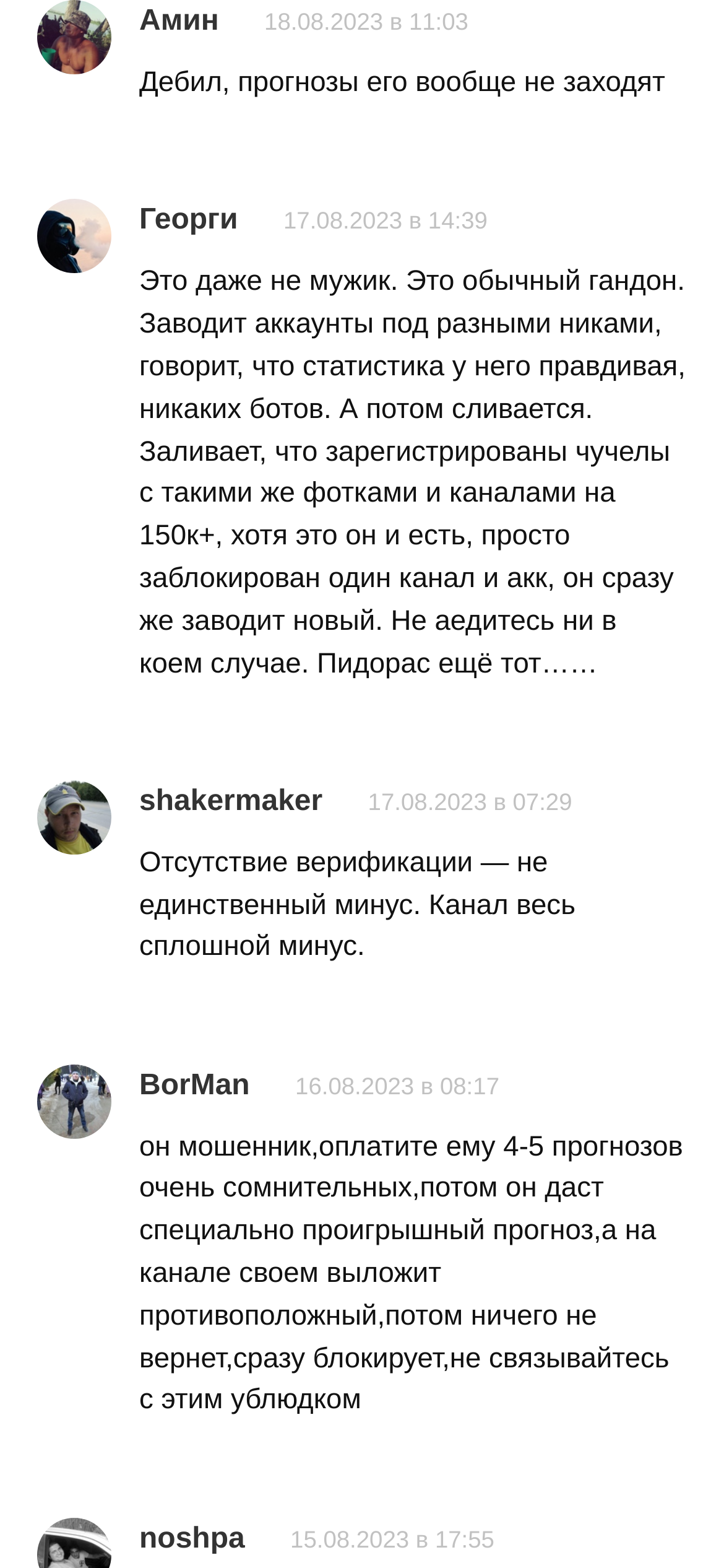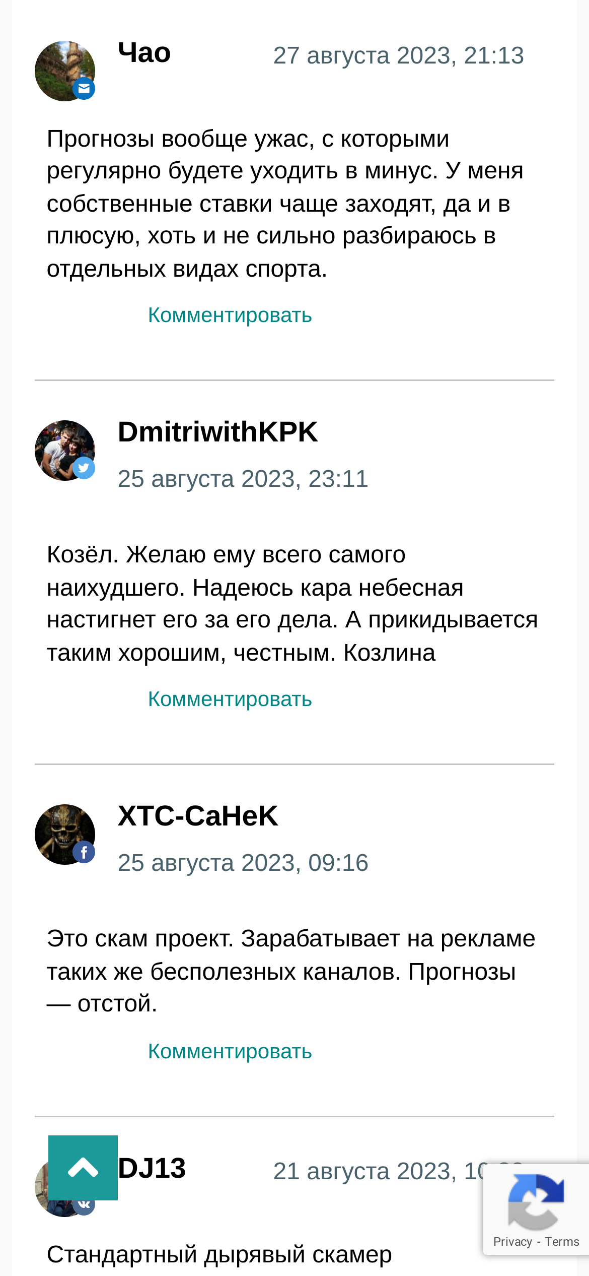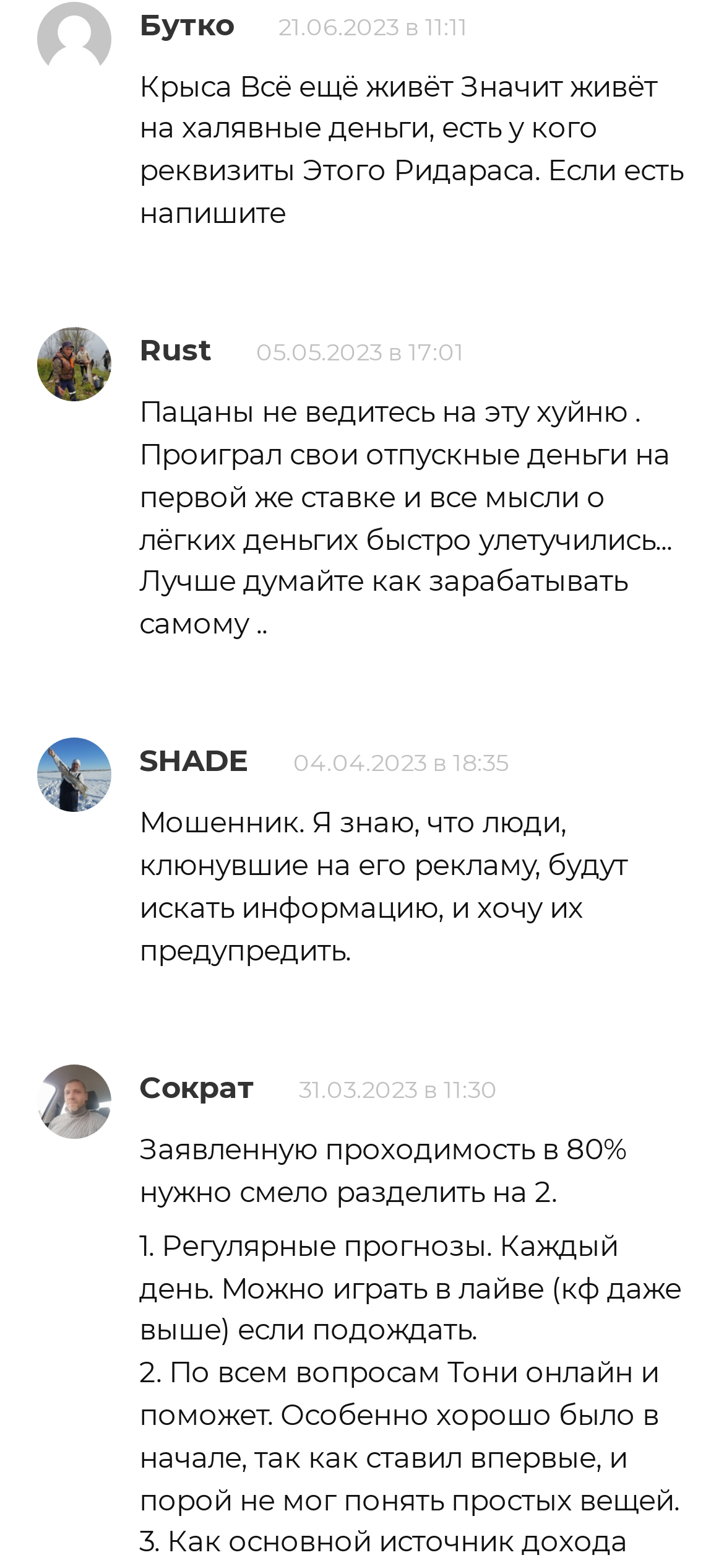 На независимых форумах беттинговой тематики в сети мы нашли множество негативных отзывов жертв этого афериста. Пользователи рассказывают, что реальная проходимость прогнозов даже из ВИП-чата находится на крайне низком уровне, не говоря уже про экспрессы, которые не заходят от слова совсем. Все это очень контрастирует с положительными отзывами на самом канале, которые мошенник выкладывает каждый день.