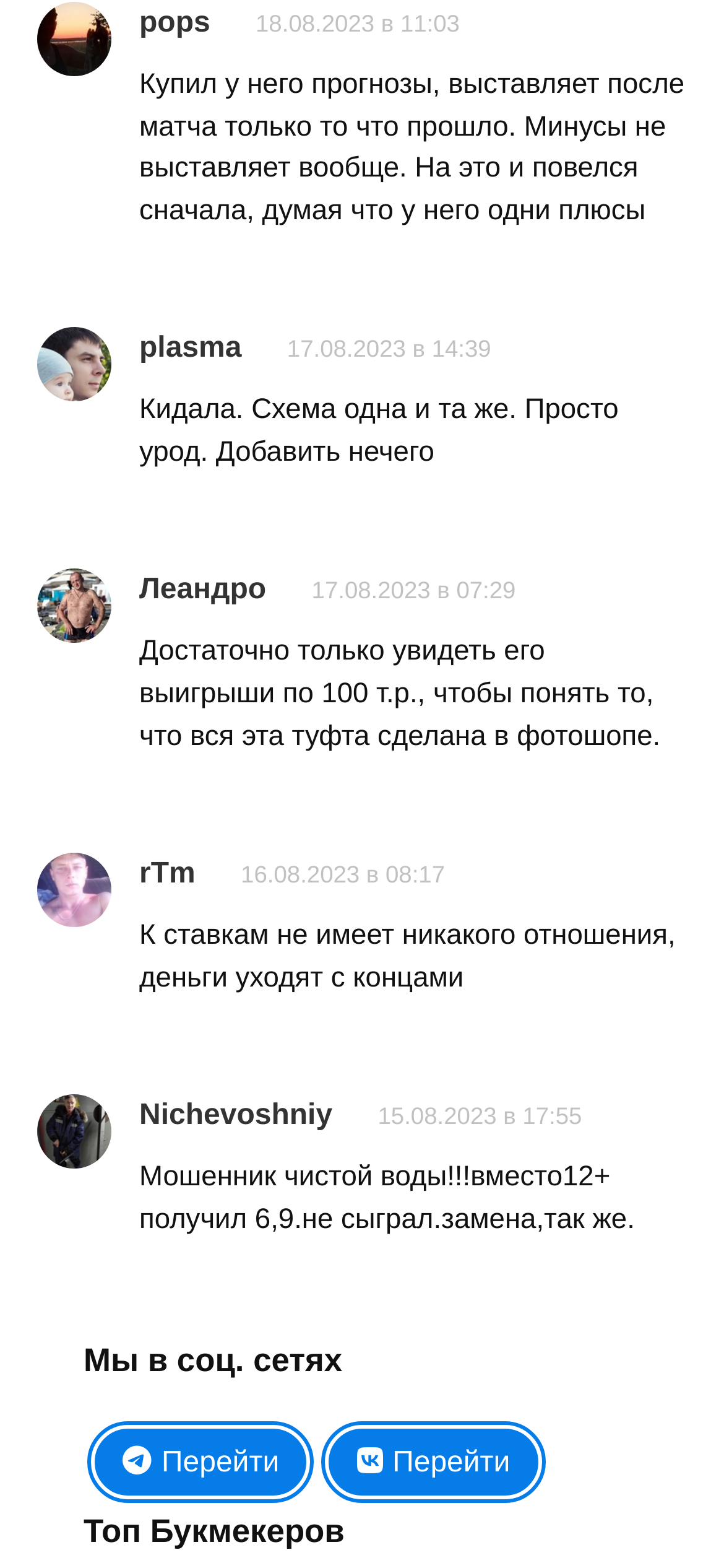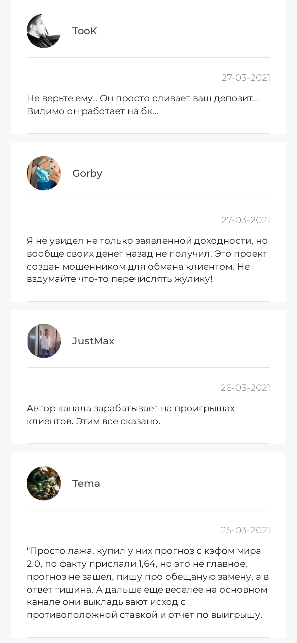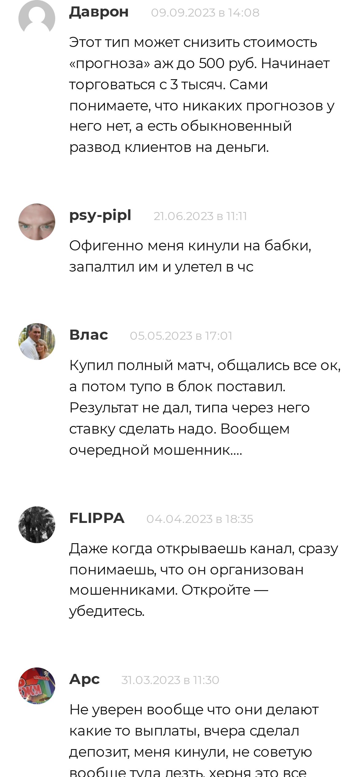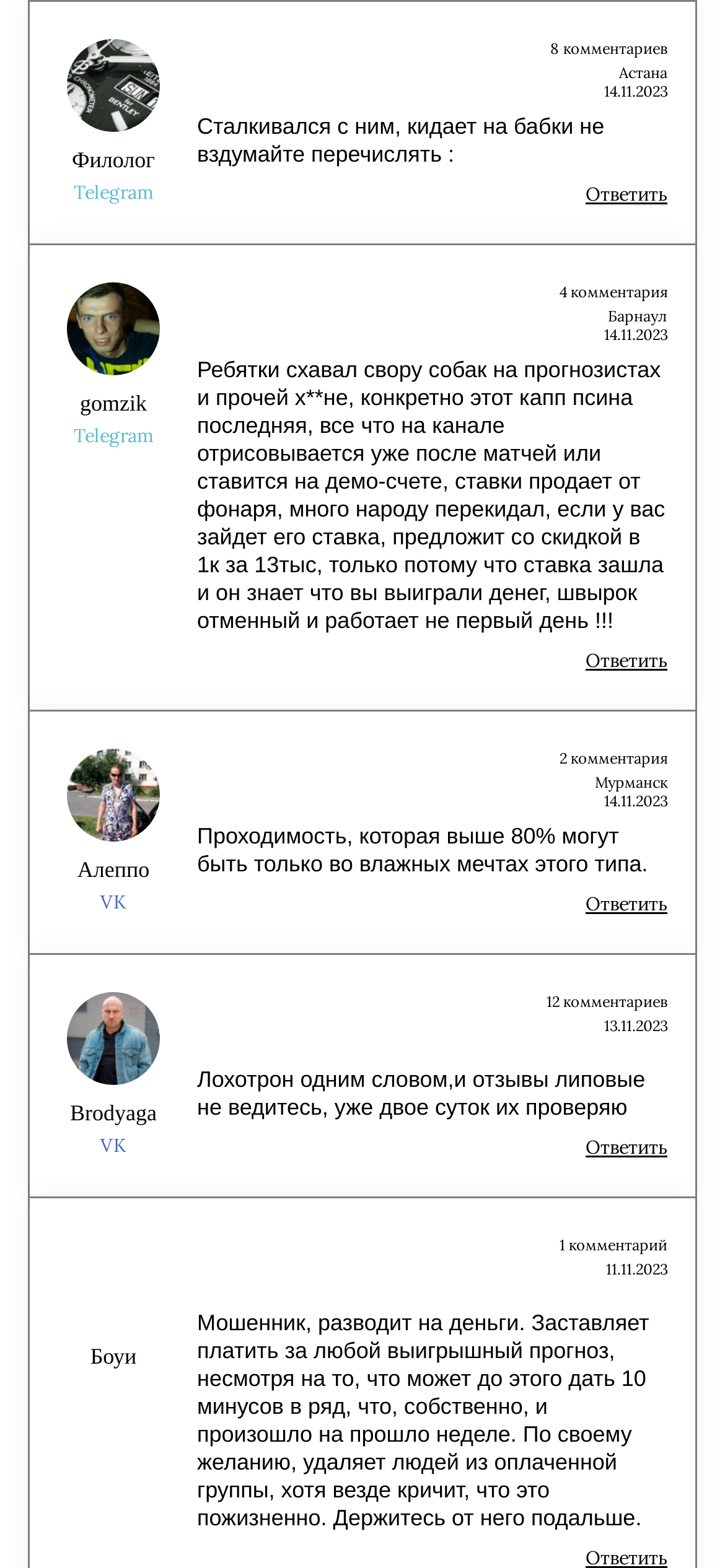 Как пишут пользователи, каппер занимается разводом на деньги, предоставляя убыточные прогнозы. Беттеры, которые решили воспользоваться раскруткой счета, были занесены в черный список и своих денег не получили. Все сводится к тому, что Ершов не является профессиональным прогнозистом.