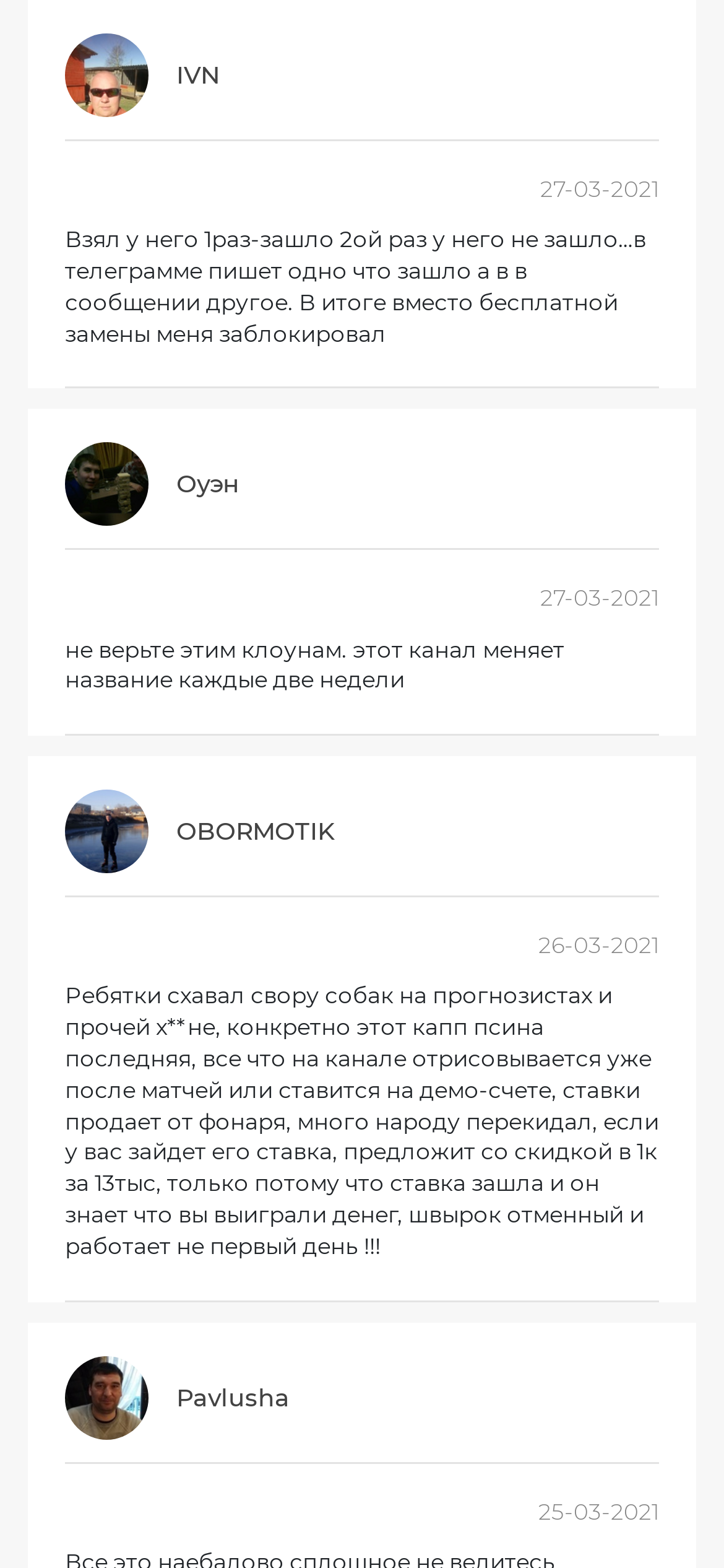 На независимых сайтах подтверждения таким откликам беттеров нет. Напротив, игроки публикуют большое количество негативных отзывов с жалобами на низкую проходимость прогнозов, подмену результатов в статистике.