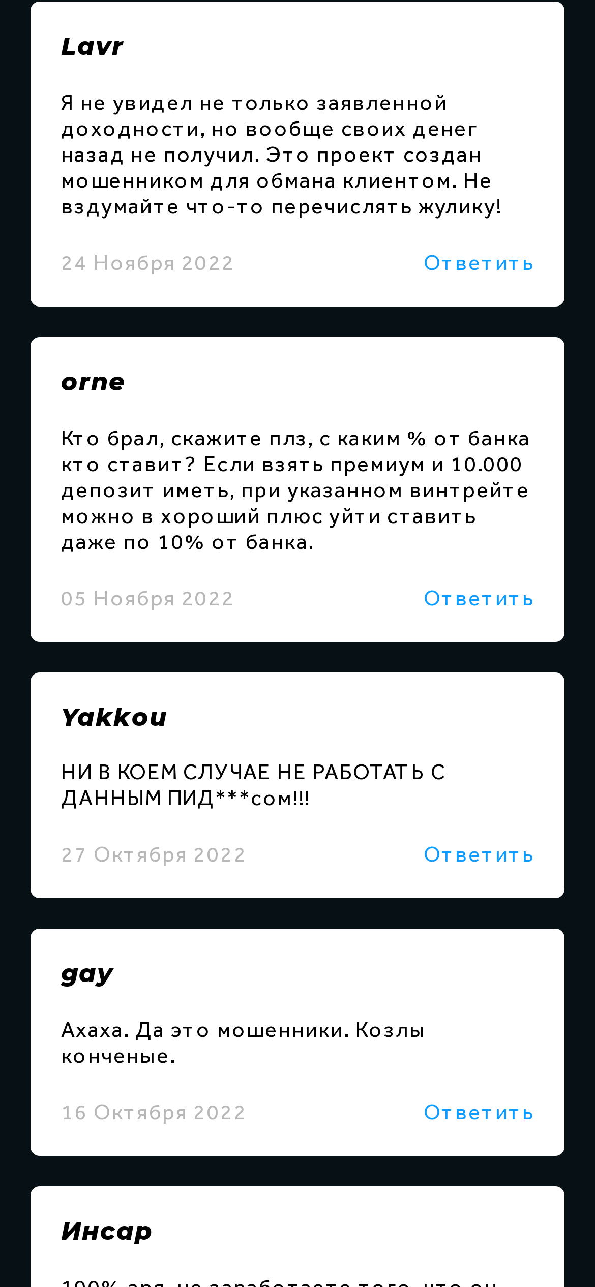 Цен вступления в ВИП-чат или единичных прогнозов здесь не найти. Единственный формат сотрудничества — внесение депозита. Минимальная сумма — 100 рублей. Чем больше сроки инвестиций, тем больше дополнительных преимуществ: увеличивается процент прибыли, появляется возможность капитализировать заработок.