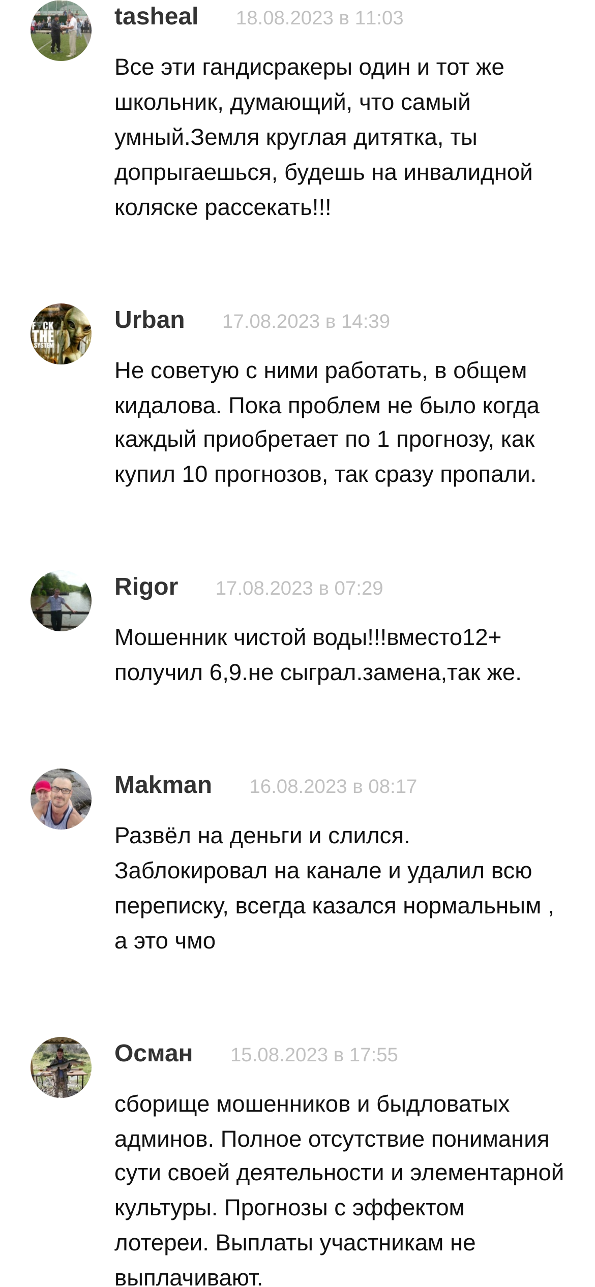 В октябре 2023 года аналитик предлагает купить по невысокой цене экспрессы с коэффициентами 2,00-2,20 и в подарок получить еще один — с значением 5,00. Стоимость — озвучивает индивидуально (каждому называет разные расценки).