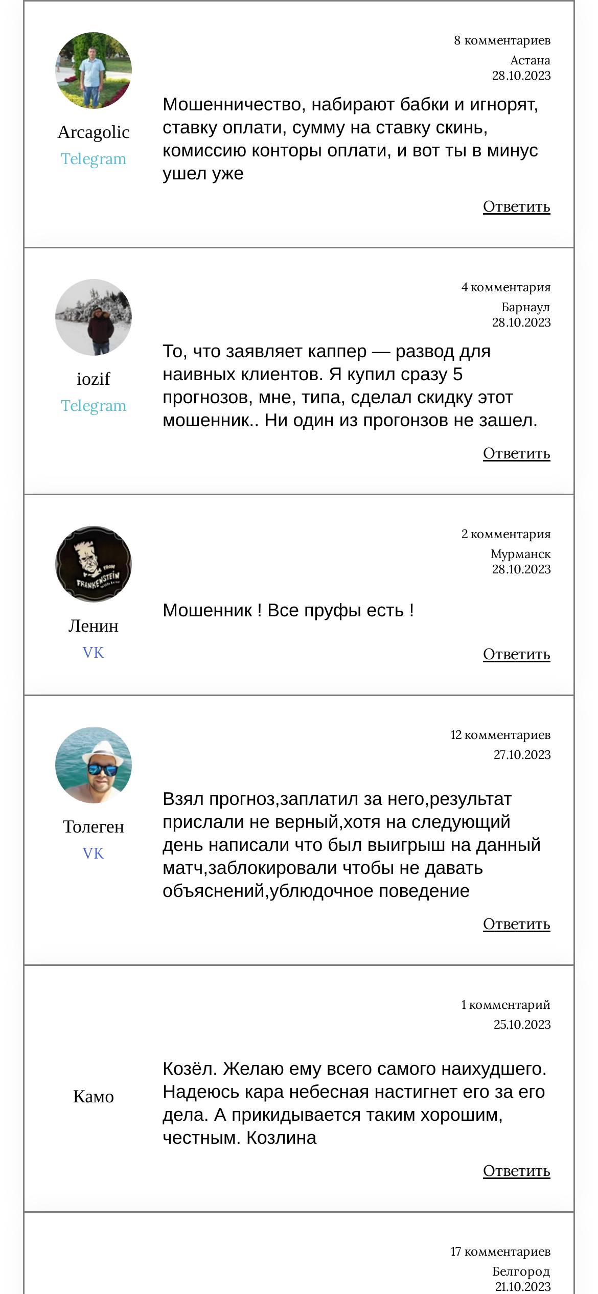 Реальные отзывы о каппере Андрей Казанцев в интернете в основном негативные. Это жалобы клиентов о том, что они столкнулись с обманом и потеряли свой банк. Те редкие положительные отзывы, которые есть, вероятно оставил сам каппер Андрей Казанцев, потому что по содержанию они похожи на фейк и не вызывают доверия.