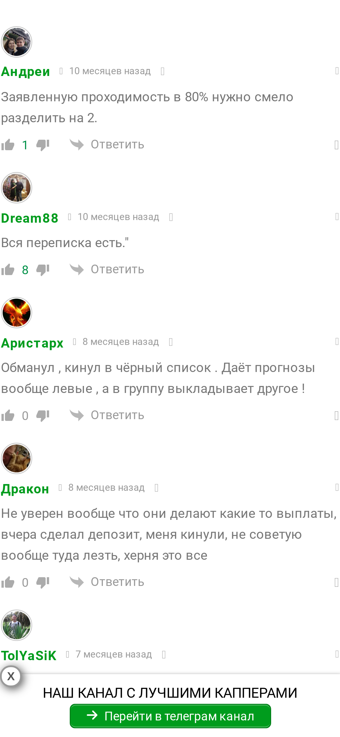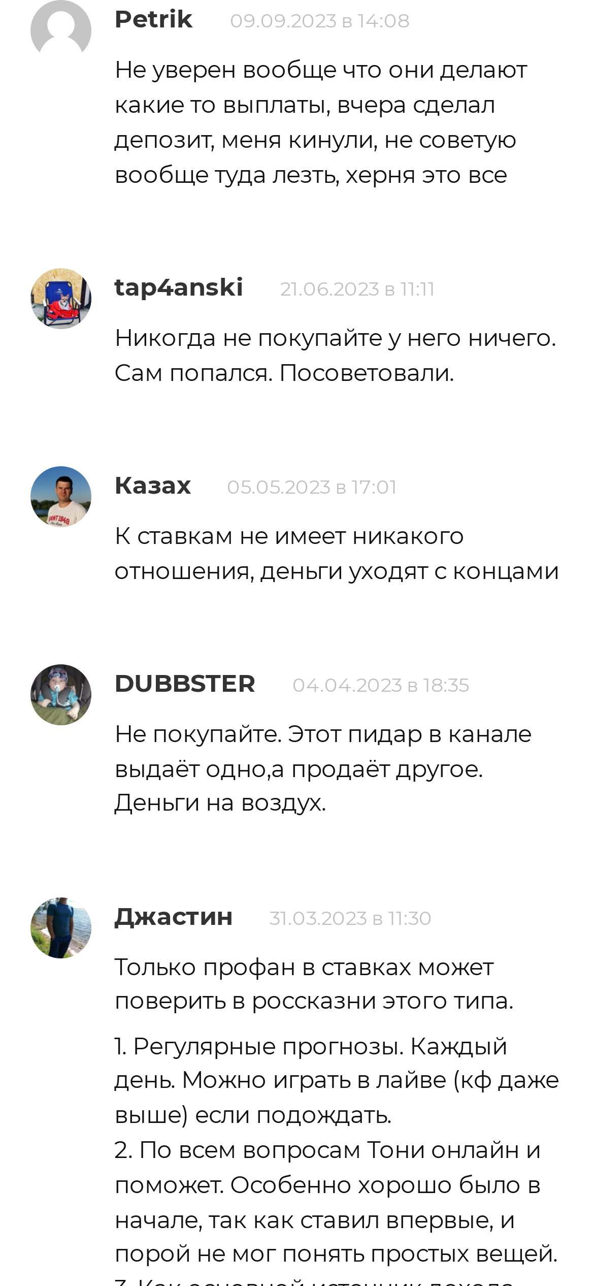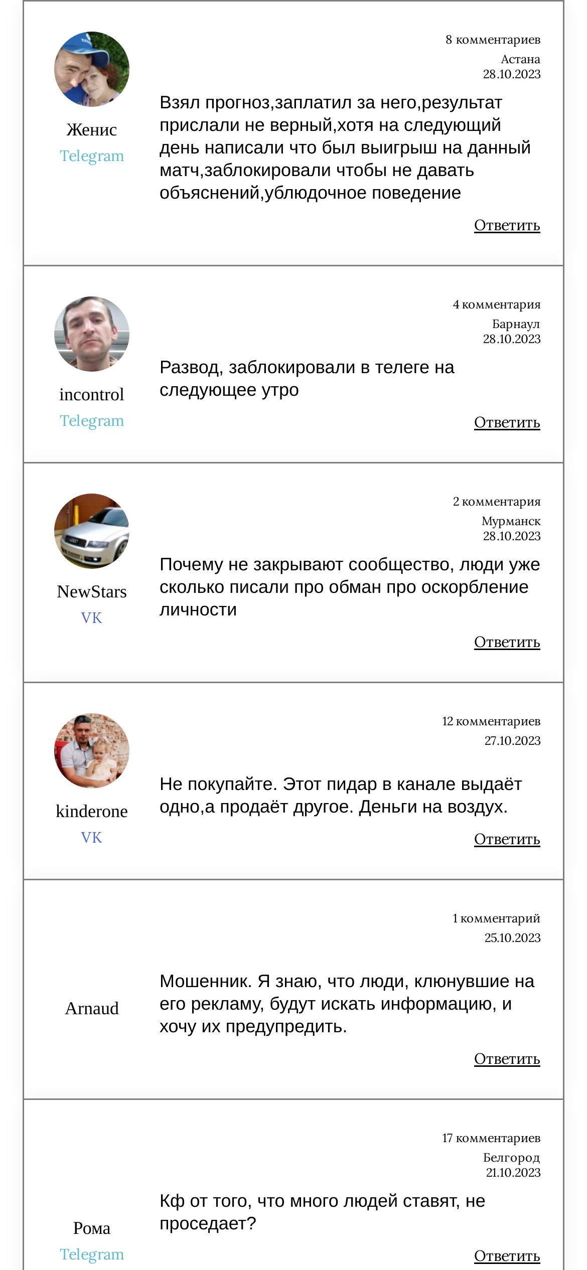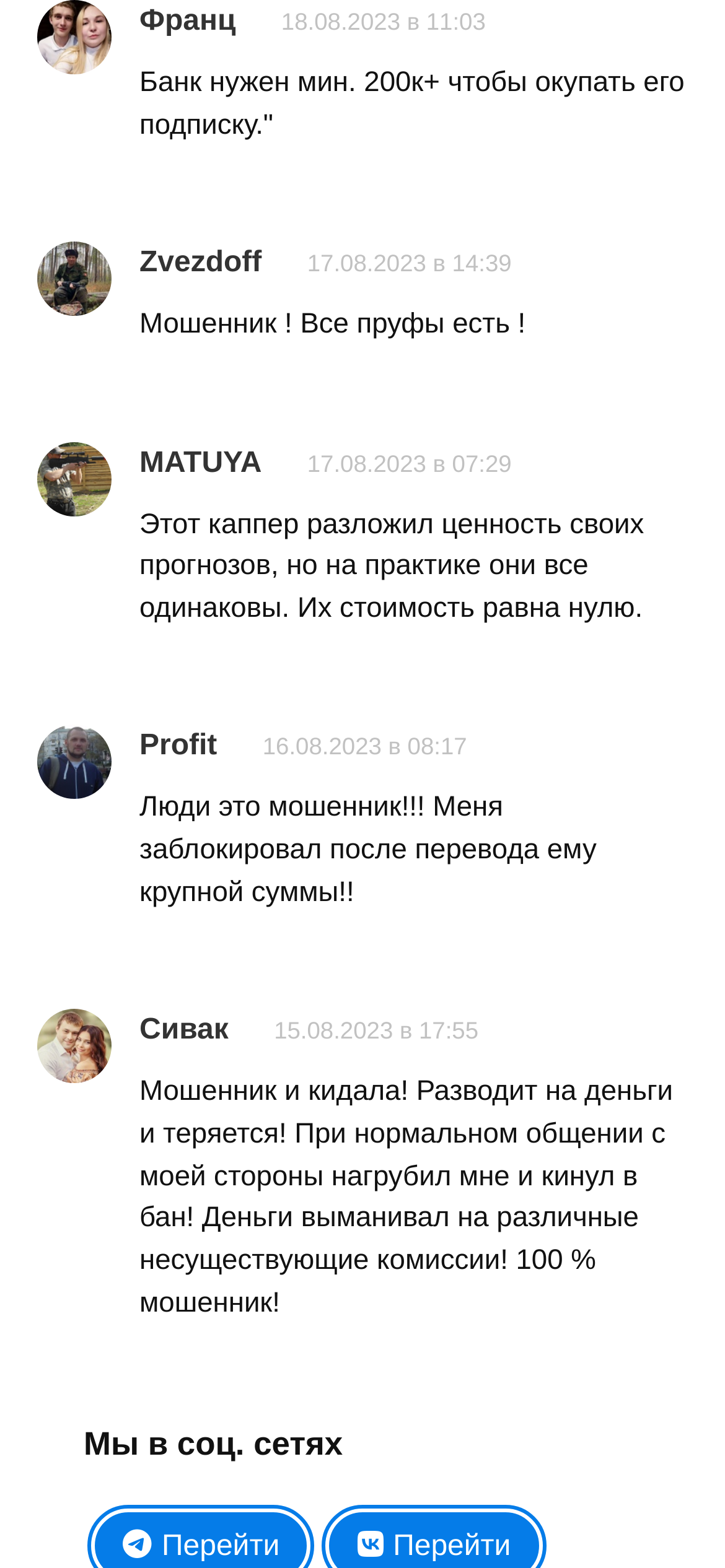 Реальные пользователи пишут, что ставки Масиса Овсепяна не заходят. Беттеры, которые решили раскрутить свой счет благодаря админу, жалуются на прогнозиста, ведь он просто слился с их деньгами и занес подписчиков в черный список.