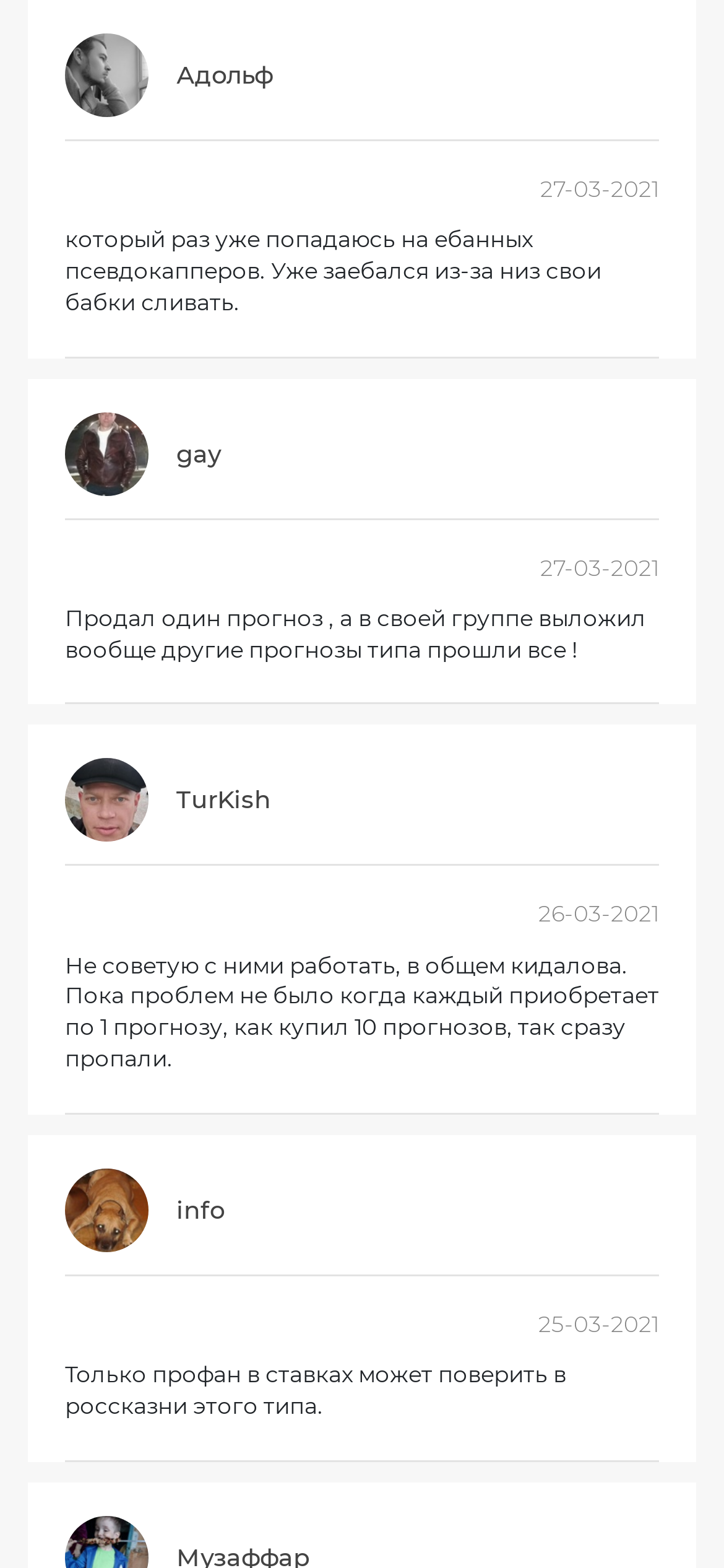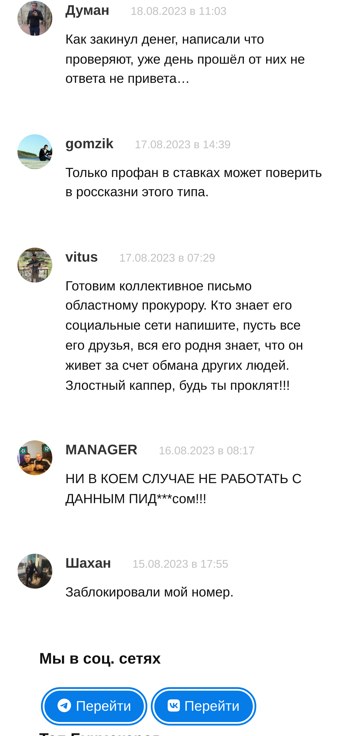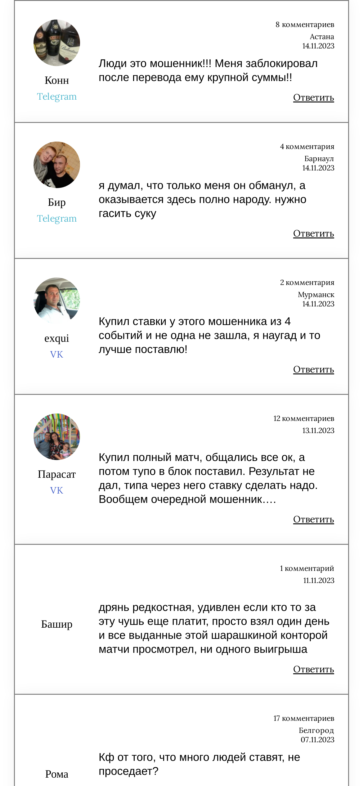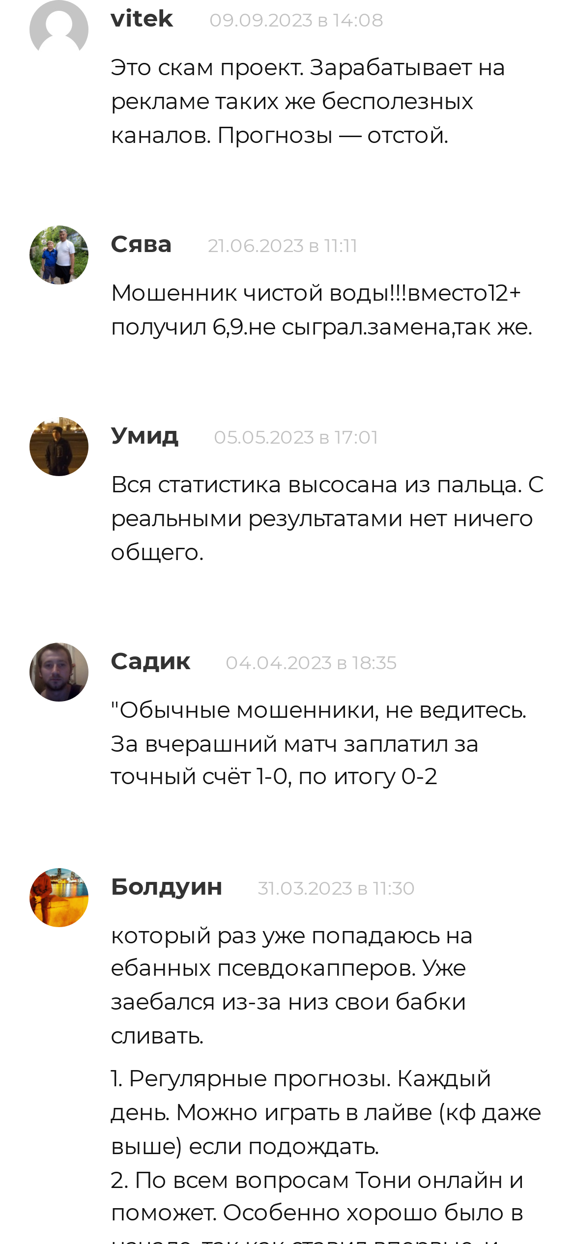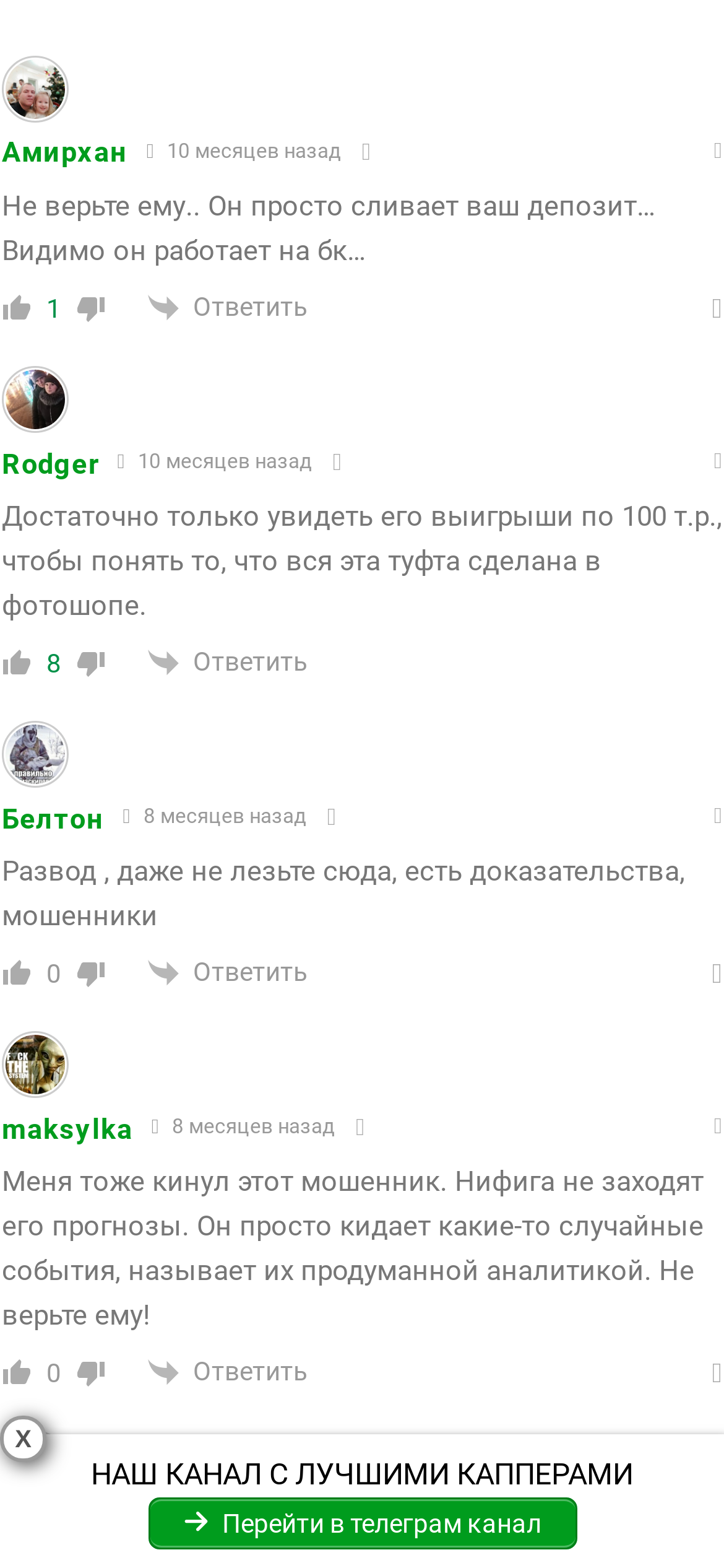 Комментарии на канале закрыты, положительный фидбек о себе автор тоже не выкладывает. Что касается независимых интернет-ресурсов, то там жалобы на проект или хотя бы упоминания от клиентов каппера отсутствуют. Это подтверждает, что его аудитория – фейк, а также не дает объективно оценить качество прогнозов с канала.