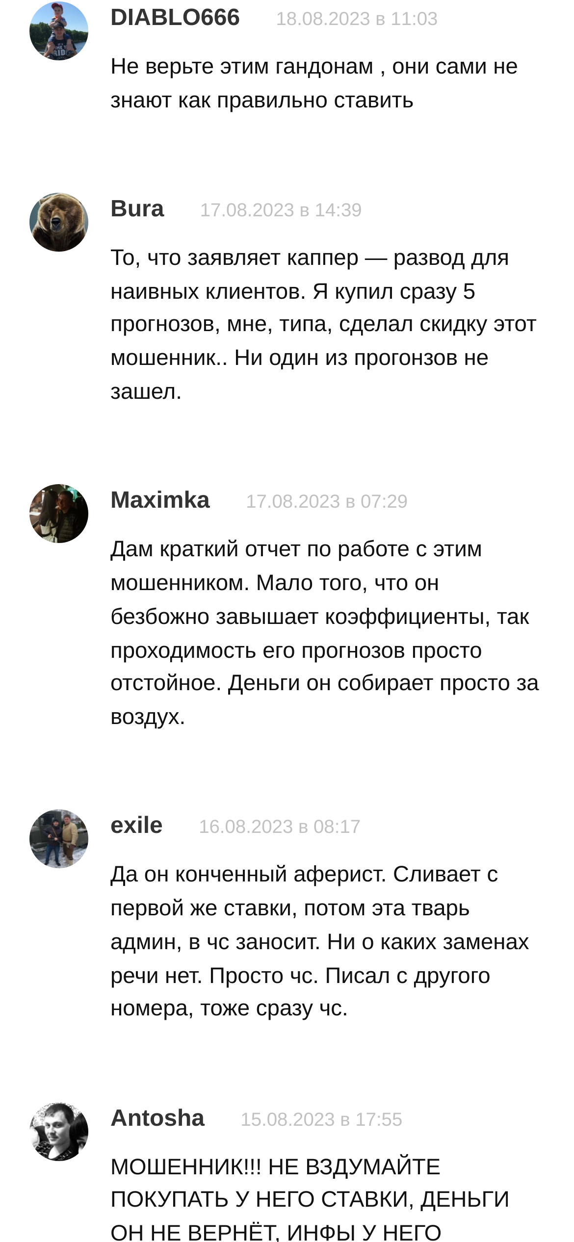 Да уж, согласен, мошенников хватает на рынке ставок. Но когда находишь нормально, все начинает играть другими красками. Мне вот недавно товарищ подкинул одного нормального, он кстати в топе на этом сайте http://luchshie-kappery.ru/turfforce-kapper/. Так вот, я брал у него несколько матчей, такие исходы предсказывать невозможно, уверен у него есть реальная инфа на руках, ну или он перепродает ее. В целом мне пофиг, главное чтобы играло.