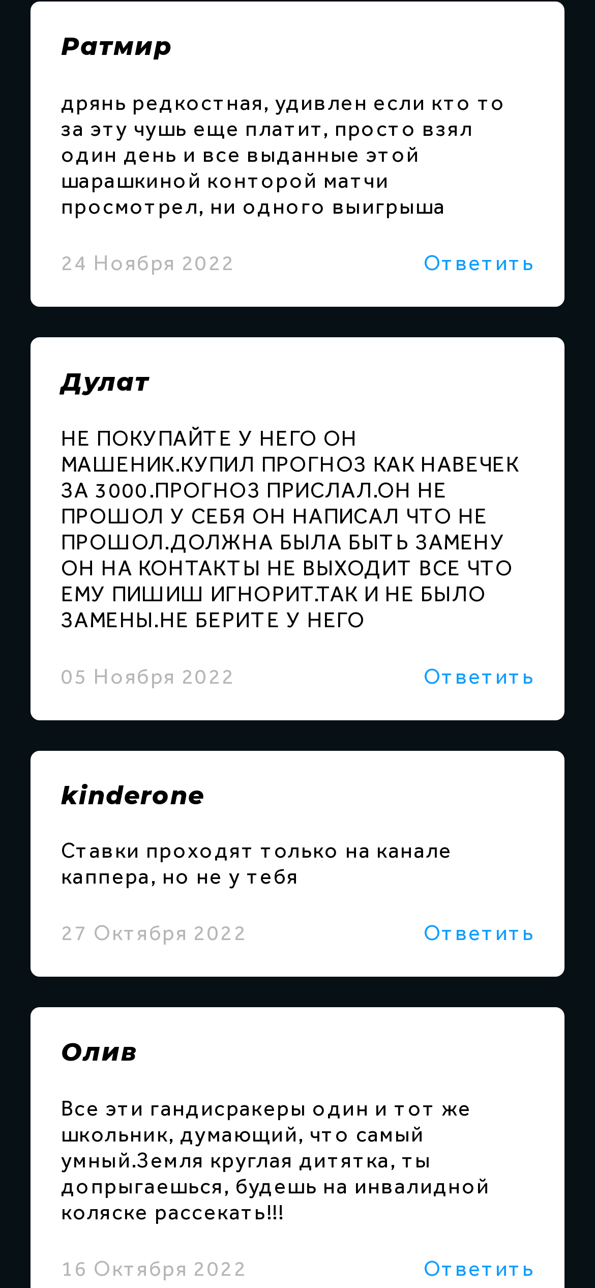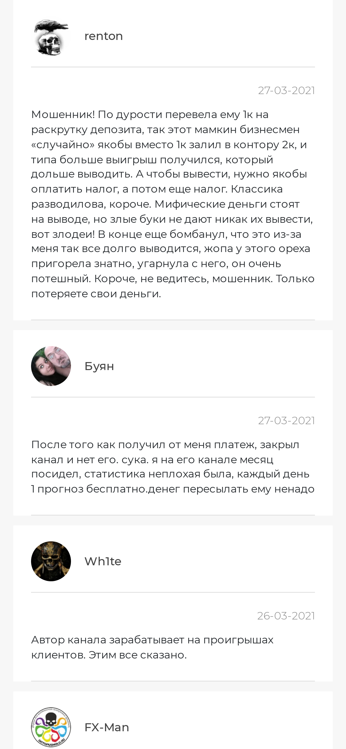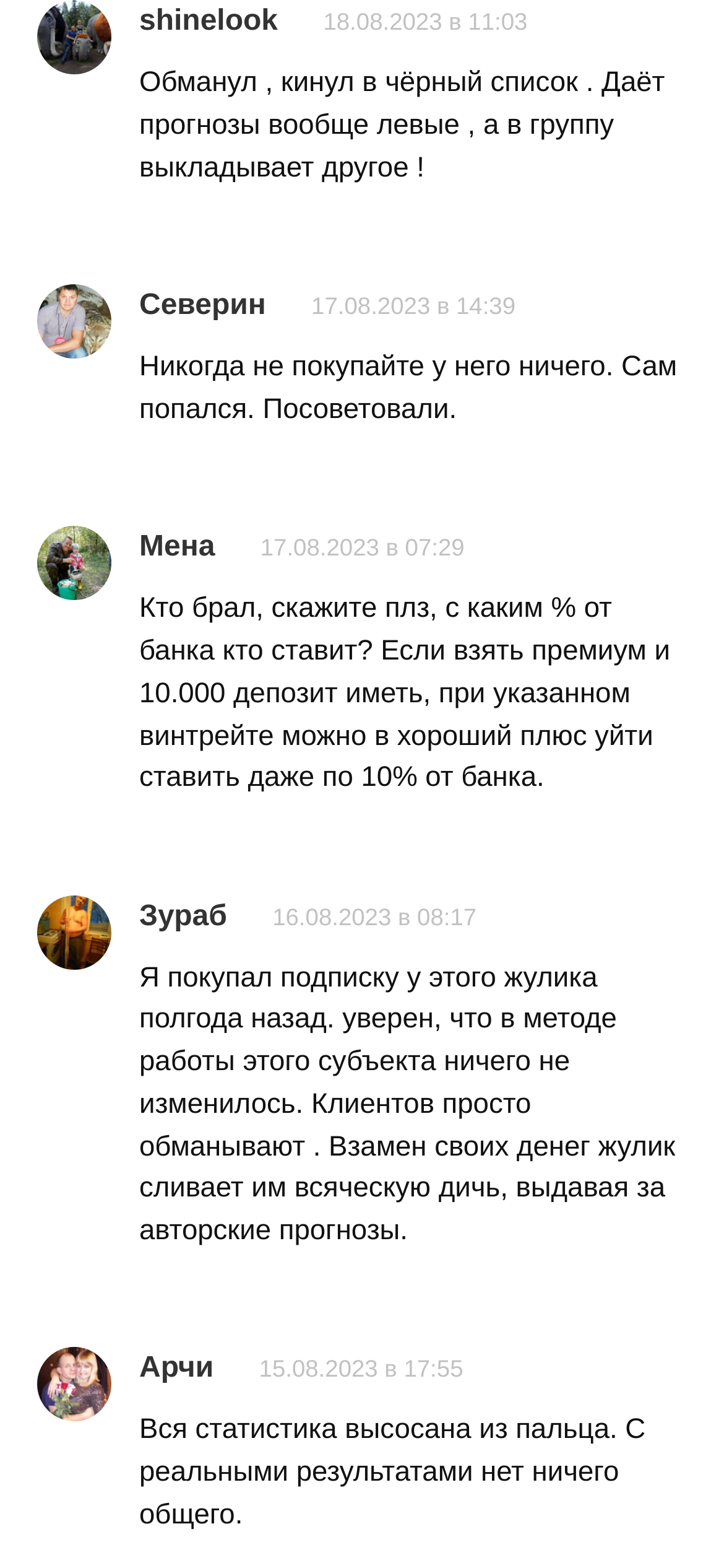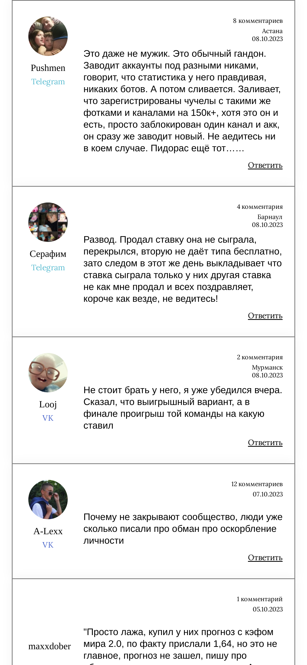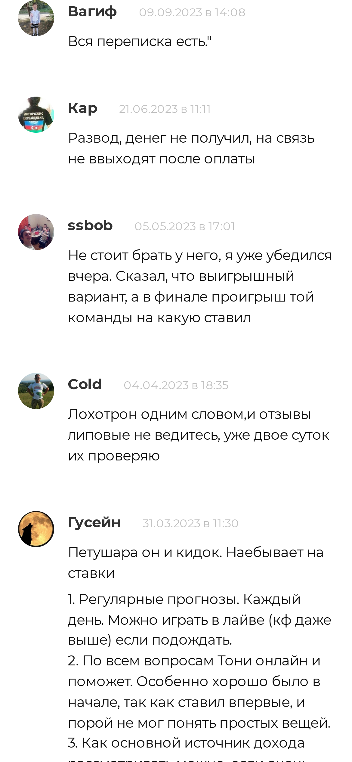 По данным на июнь 2023 автор сообщал о проходимости платных прогнозов на уровне 80%. Такой результативности при заявленных КФ не добиться, сообщения о проходимости выглядят фейком.