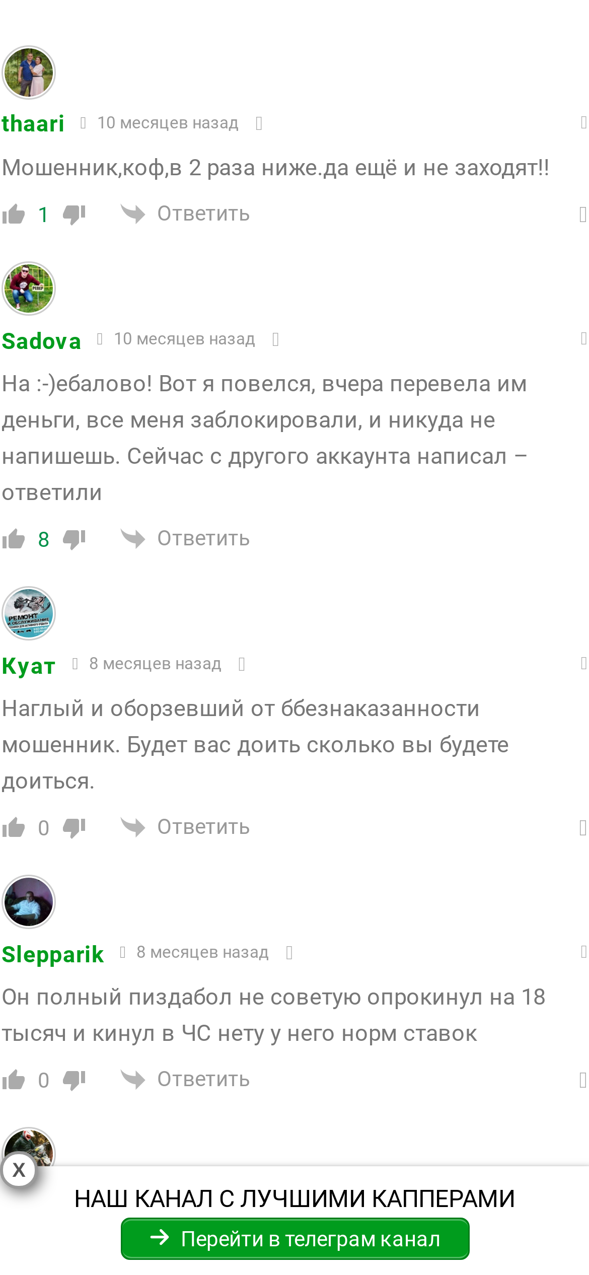 Пару раз в неделю тут публикуют призывы вступать в сомнительные каперские проекты. На Матчи по сценарию продвигают каналы по раскрутке банка, продаже экспрессов с большими КФ.
