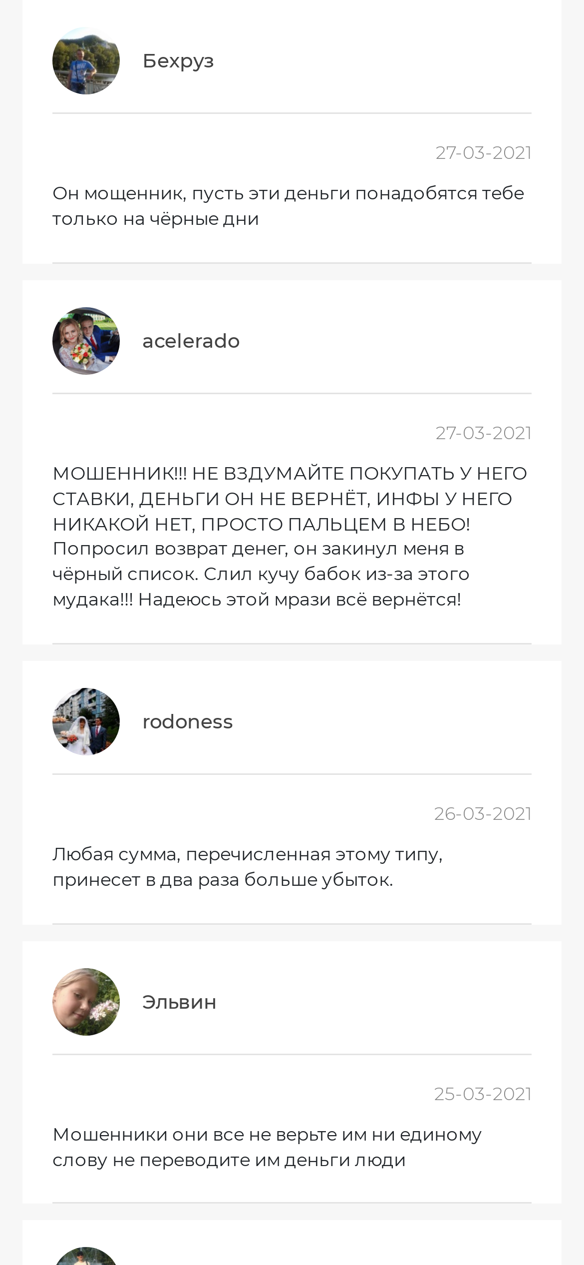 Отзывы о Dan Rus в сети негативные, в жалобах бывшие пользователи рассказывают, что потеряли от 10 000 рублей. Мошенник прикидывается добропорядочным человеком, который готов помочь всем нуждающимся, показывает это при помощи фейковых скриншотов переписок и видео якобы от бывших клиентов. Но все они сделаны с командой, либо заказаны на специализированных порталах.
