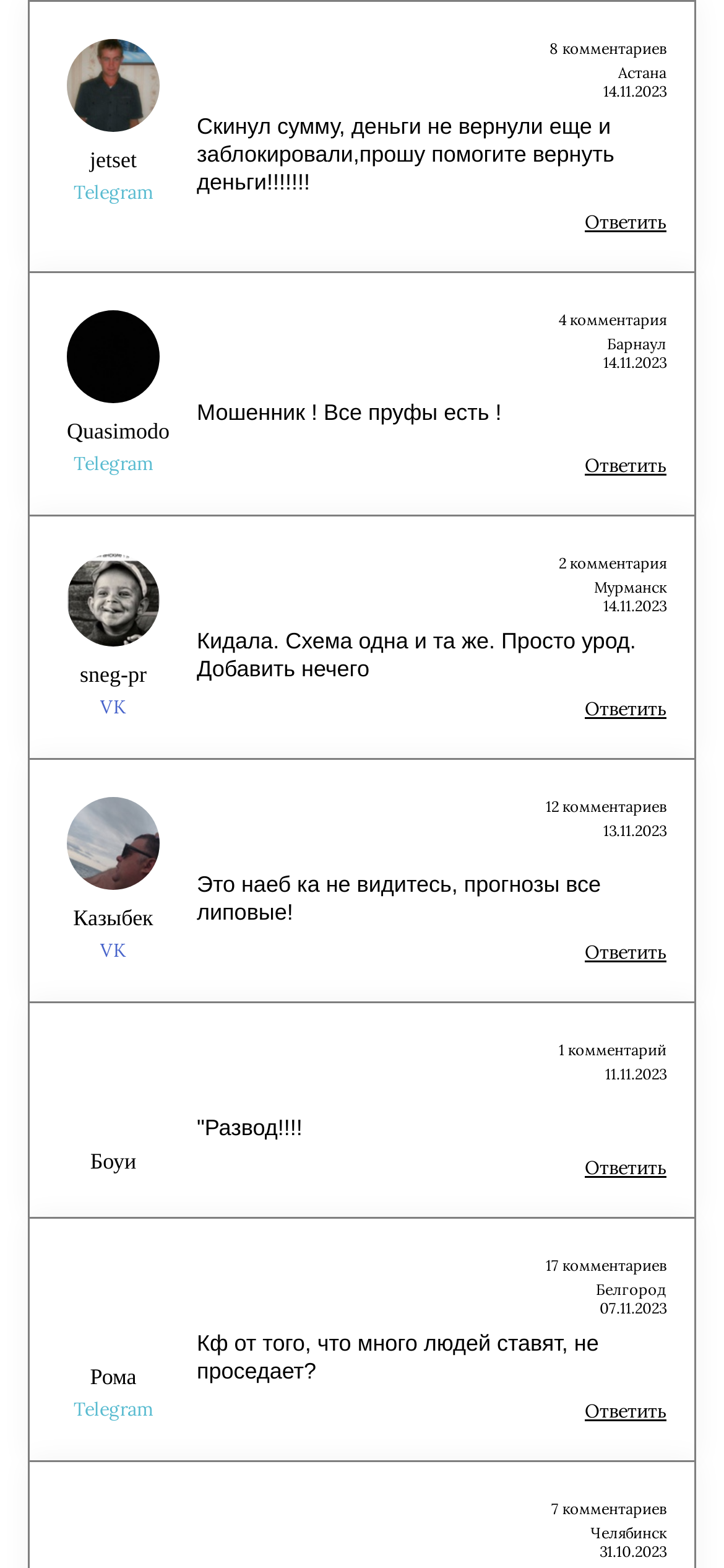 В ленте появляются ставки на один вид спорта — футбол. Матчи выбирает из разных по величине турниров — от высших до низших. Разброс большой, при таком отборе страдает качество ставок. Описание с анализом к постам не прикладывает. Предлагает заключать ставки в формате ординаров и экспрессов.