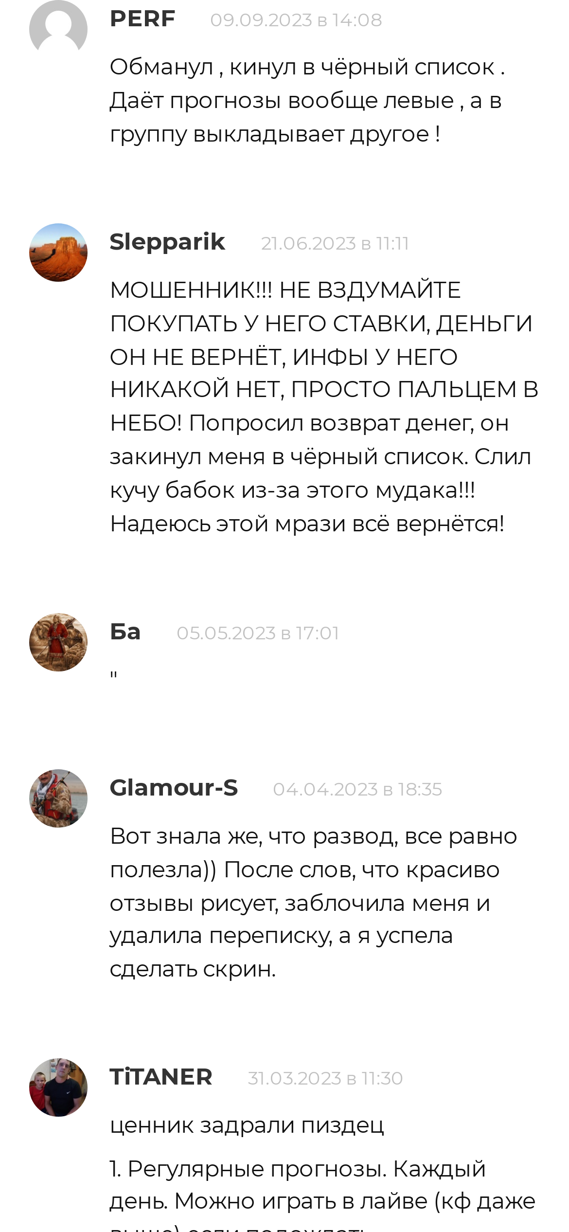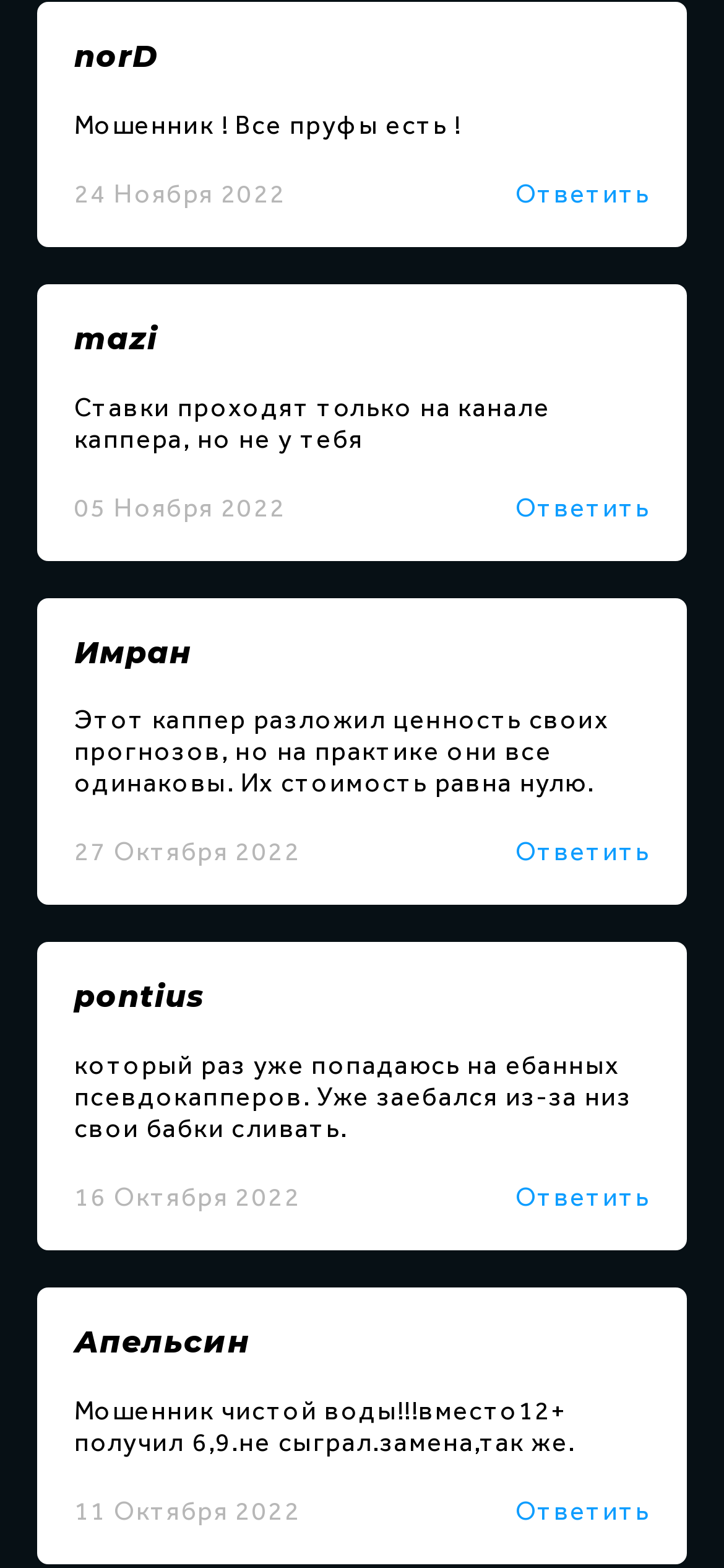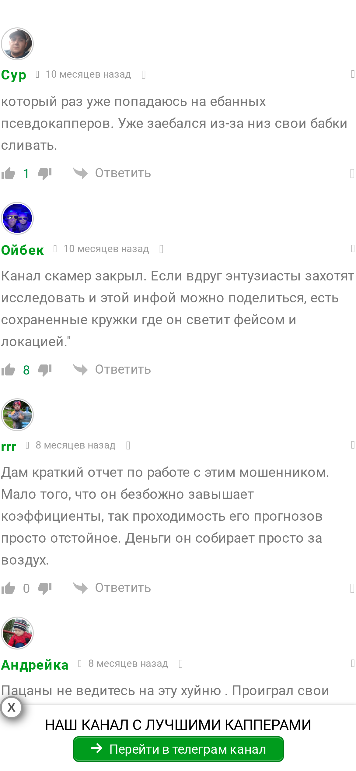 Ставки каппера не проходят верификацию через специализированный сервис. Да и проставлением результатов под постами он не утруждает себя. Коэффициенты средние — от 1,4 до 1,7. Показатели быстро проседают, так как БК их часто выставляют для популярных исходов.